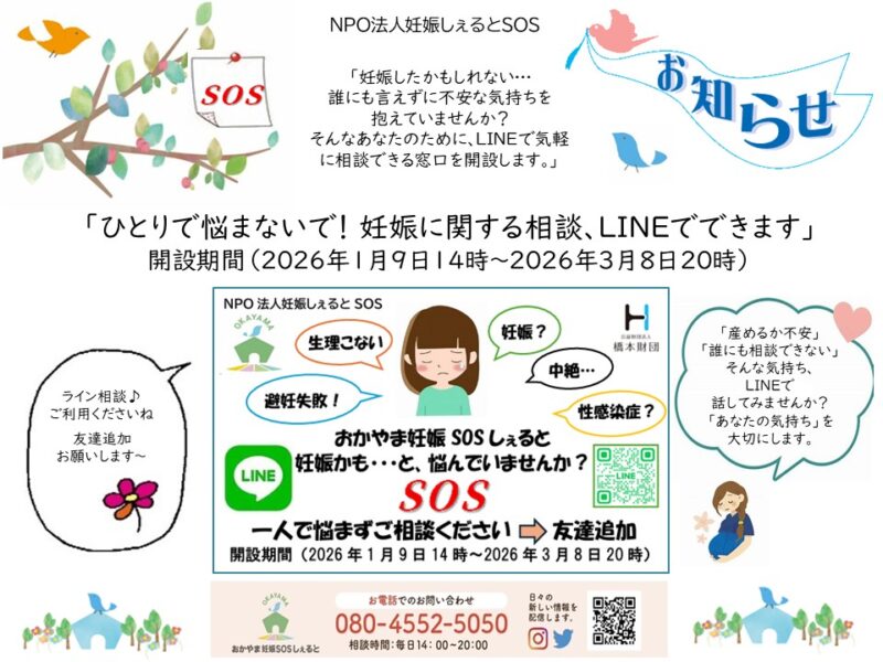 2026年1月9日(金)14時から、LINEでの妊娠SOS相談が始まります! LINE相談用のボタンから、友だち追加してご相談くださいね。