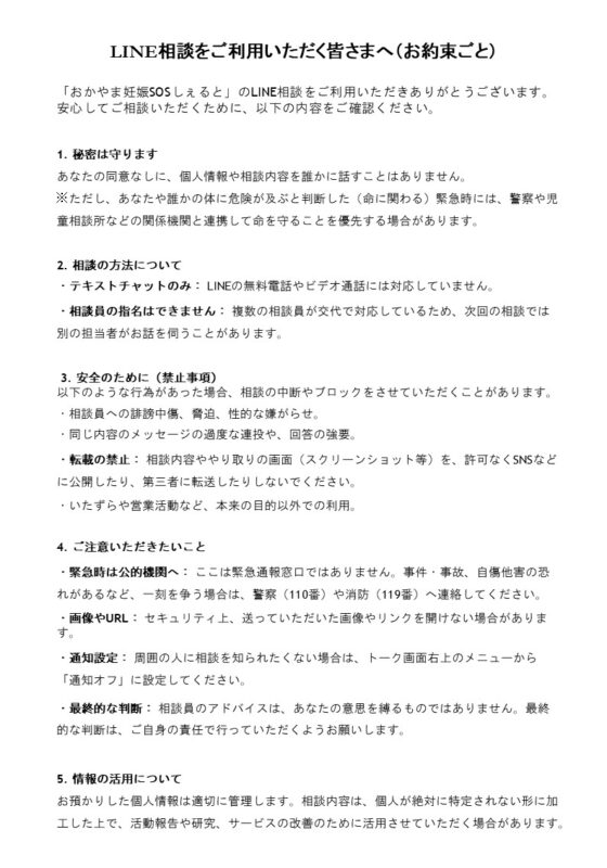 2026年1月9日から始まるLINEでの妊娠SOS相談のお約束ごとをお伝えします。 同意したうえでご相談くださいね。